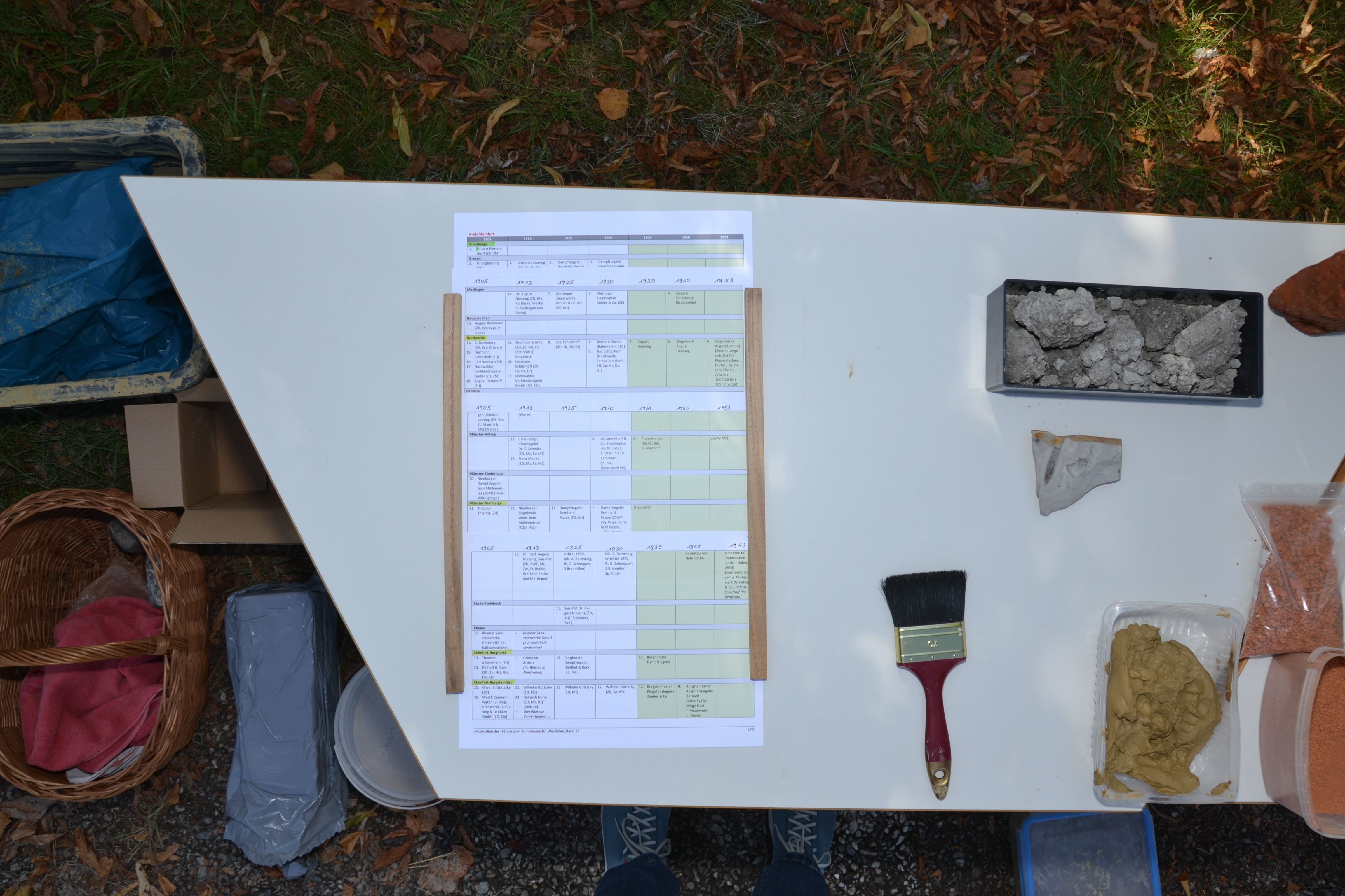 Begleitet von herrlichem Wetter fand im Steinemuseum Zurholt Anfang September der Workshop Fresko-Malerei statt. Angereist aus dem Münsterland hatten die Teilnehmerinnen viel Platz und Zeit, die Fresko-Technik auszuprobieren. So wurde am Samstag der Mörtel-Untergrund hergestellt, der für das Malen in Fresko-Technik erst noch über Nacht trocknen musste. Dann wurden aus verschiedenen Gesteinen Pigmente hergestellt. Der wichtigste Schritt dazu war das Zerkleinern der Steine im Mörser. Die Farben Schwarz (Kohleschiefer), Dunkelbraun (Eisenoxid), Orange (gebrannter Ziegel) und Weiß (gelöschter Kalk, Calzit) konnten wir aus regionalen Gestein herstellen. Es gab zudem die Möglichkeit, gekaufte Pigmente zu verwenden, um beim Malen aus einem größeren Farbspektrum wählen zu können. Das entspannte Ambiente und die kreative Atmosphäre des Museumsgartens haben schöne Bilder entstehen lassen. Am Ende waren alle Teilnehmer begeistert über die Ergebnisse ihres Schaffens mit dieser allen zuvor unbekannten Technik. Hier noch ein Hinweis: Das Bild mit dem Herbstblatt-Motiv zeigt, welche Ausdruckskraft man erreichen kann, wenn man ausschließlich Farben aus Gesteinspigmenten verwendet.