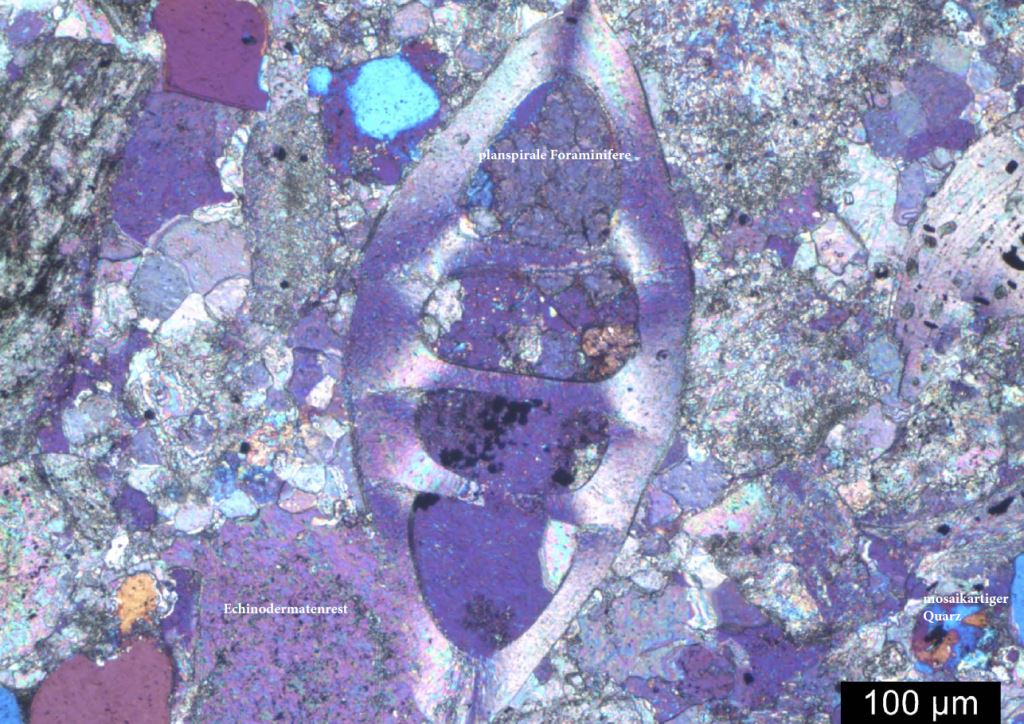 Weitere im Dünnschliff zu sehende Reste der Echinodermata können den Seelilien (Crinoidea) zugeschrieben werden. Im Dünnschliff sind Reste von Echinodermaten schwer zu unterscheiden. Bei einigen Stücken ist aber ein erweiterter Zentralkanal zu erkennen, der die Einstufung als Seelilienstilglied zulässt. (Der rechte Echinodermatenrest in Bild drei). Da die Stiele von Seelilien bei einigen Arten bis zu 20 m lang werden konnten und ein einzelnes Stilglied nur wenige cm dick ist, können sie in Gesteinen sehr häufig sein.