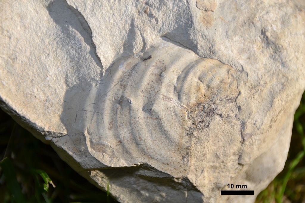 Abb.: Muschel Inoceramus im Mergelstein, Schalenerhaltung, , Foto: E. Müsch, Bild öffnen