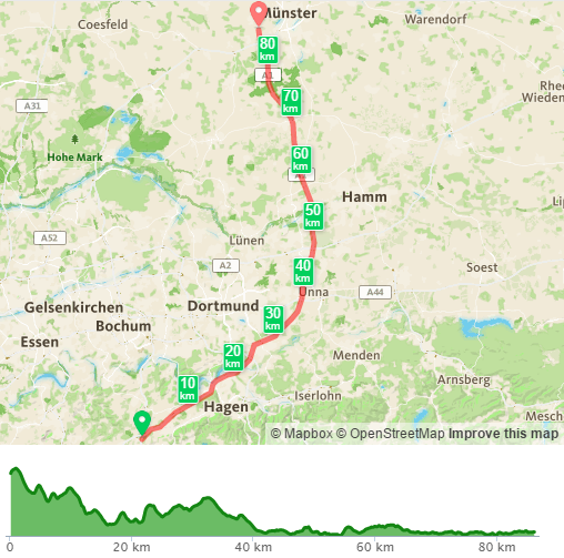 Fährt man mit dem Auto vom Autobahnkreuz A1/A43 (Wuppertal Nord) nach Münster (Kreuz Nord), so kann man mit einer Navigations-APP den Verlauf des Kreidebeckens selber kartografieren. Das Ergebnis zeigt die Karte und das Höhenprofil unten.